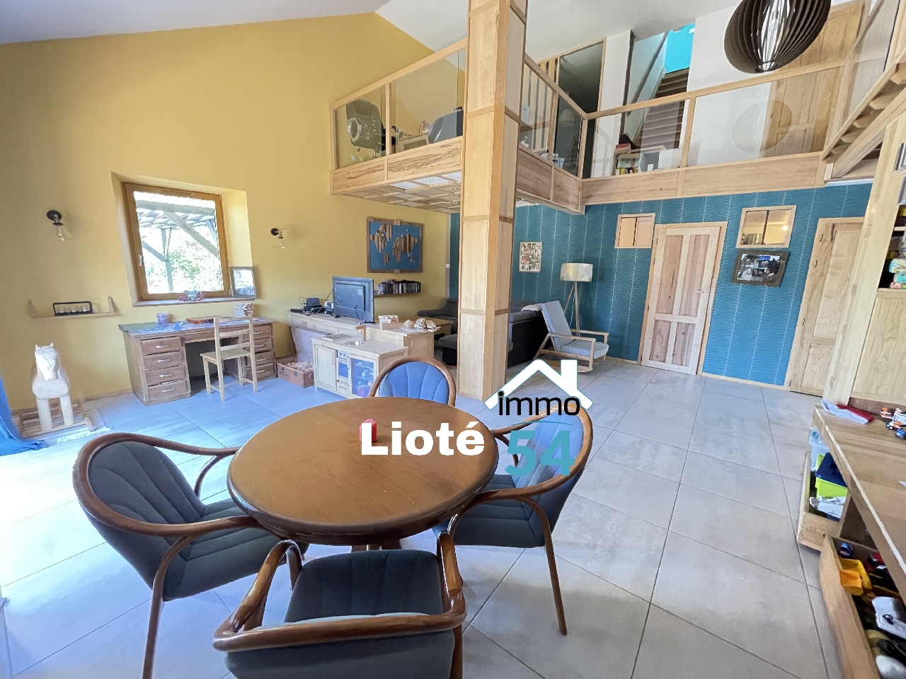 À létage, une mezzanine accueille un bureau et une chambre semi-ouverte. Vous trouverez également trois autres chambres confortables, une salle de bain, un grand palier et un couloir desservant les pièces.