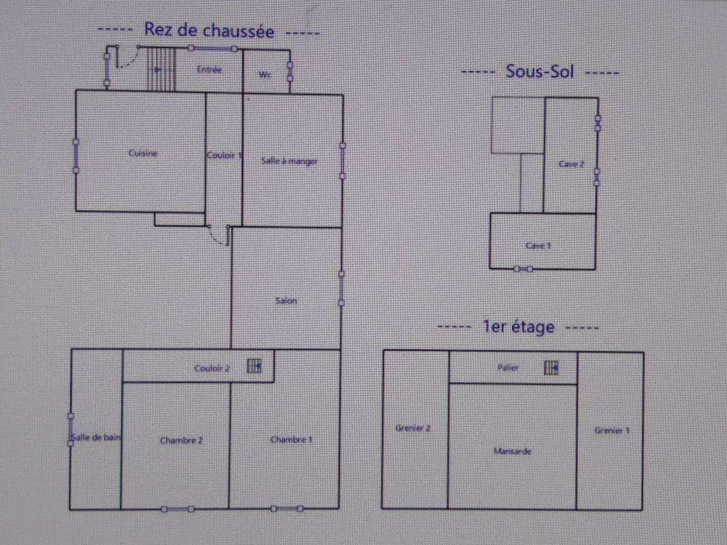 1° Appartement de 75 M² cuisine équipée, grand salon salle à manger, salle de bains (douche) 2 chambres, WC cave. Etage mansarde, grenier.