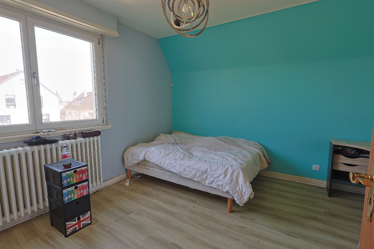 Exclusivité. Cette maison vous attend dans un environnement très calme à Colmar Mittelharth. Reposant sur un terrain de 500 m² cloturé, elle est érigée sur un sous-sol intégral comprenant un grand garage. Le rez-de-chaussée est composé d'une pièce de viede 28 m² avec un poêle à bois, d'une cuisine aménagée, d'une grande chambre et une salle d'eau. Le premier étage accueille les 3 autres chambres de 11 m² à 18 m² ainsi qu'un wc. Terrasse orientée Sud-Est. Climatisation réversible installée dans toutes les chambres. 371 000 Euros FAI. Pour tout renseignement ou visite contactez Laurent Saint-Huile au 06.74.60.21.75